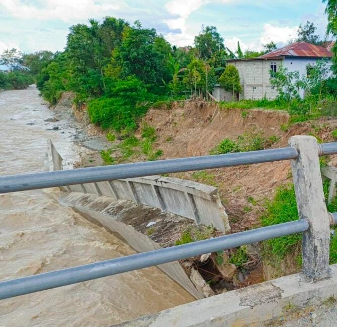 KERINCI – Turap atau penahan tanah di sekitar Jembatan Pegeh rusak dampak banjir dan longsor pada akhir Desember 2023. Turap lama bergeser ke ujung sungai akibat bencana alam.